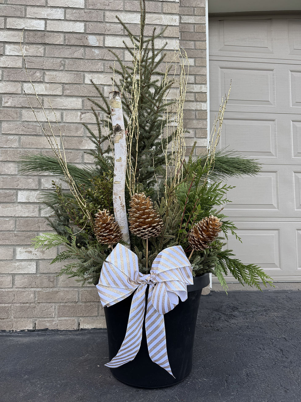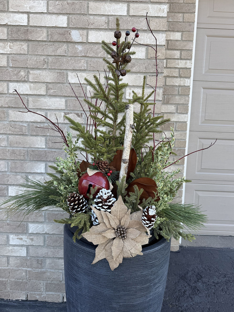 Custom winter planters designed to bring warmth, texture, and seasonal beauty to front porches and entryways throughout Minnesota. Each arrangement is thoughtfully composed to feel festive, welcoming, and uniquely suited to its setting.